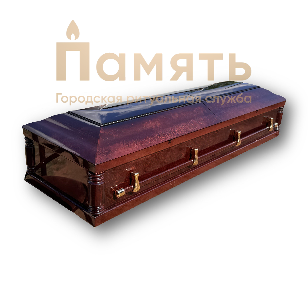 Гроб двухкрышечный - ГД-4 имеет прямоугольную форму. Крышка вкладная, двустворчатая. Механизм раскрытия: мебельные петли+мебельные лифты. Изготовлен из массива ольхи с глянцевым покрытием. Постель: габардин. Фурнитура: металл, дерево