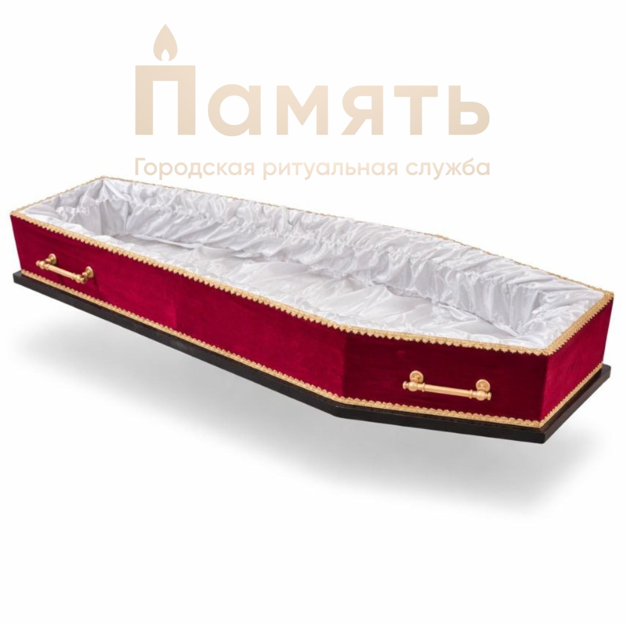 Гроб «Гофра» обитый тканью Велюр, с накладной крышкой - Красный изготовлен из ДСП, имеет шестигранную форму, для обивки используются атлас, наружная ткань Велюр с основой. Гроб украшен тесьмой и кружевной лентой. Дополнен изящной фурнитурой. Постель выполнена из атласа. Комплектация: ручки 4 шт, крест накладной - 1 шт