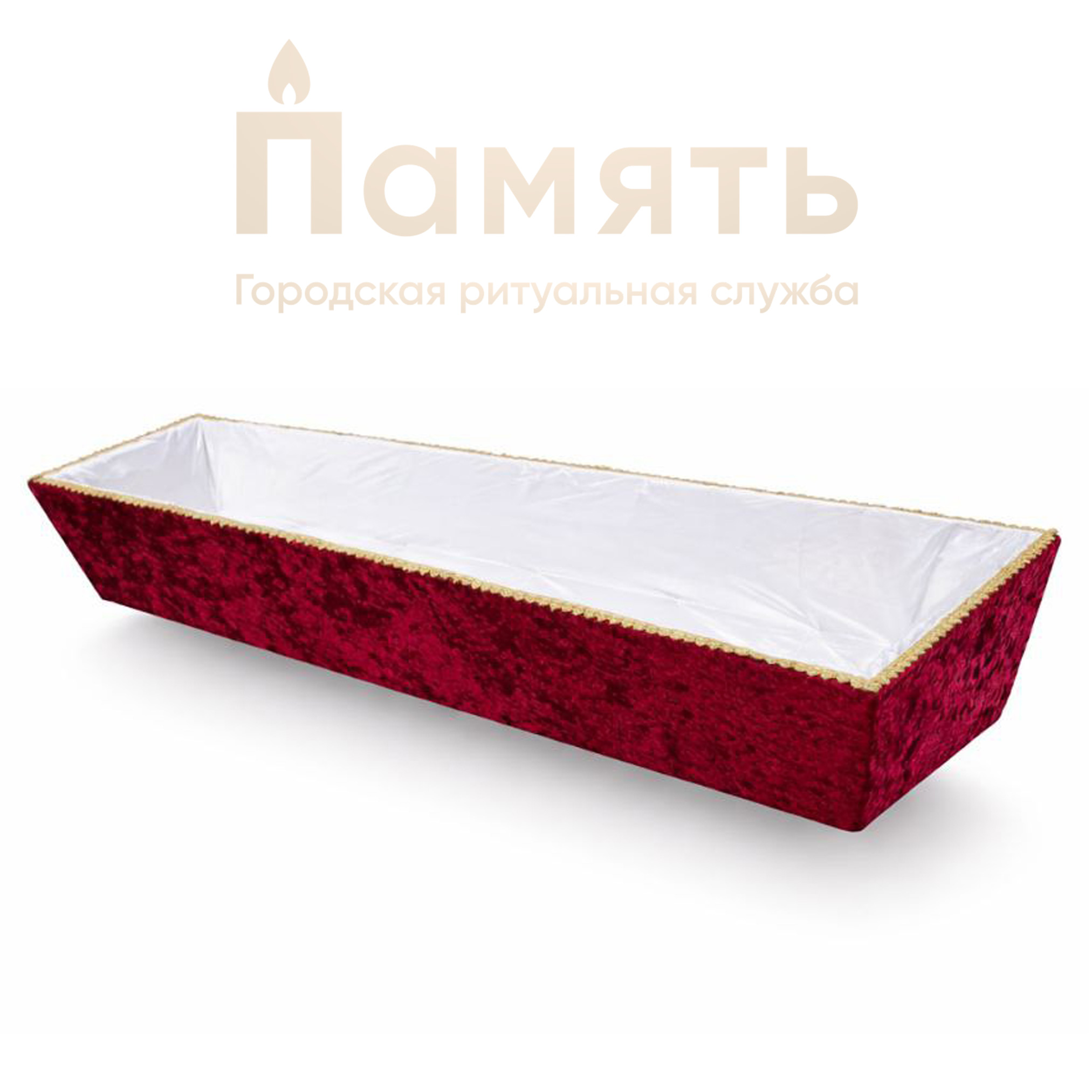 Гроб обитый тканью «Траур» - Красный изготовлен из сосны, имеет четырехгранную форму, для обивки используются велюр и атлас. По боковой плоскости украшения декоративной тесьмой. Может быть дополнен изящной фурнитурой, крест, ручки.