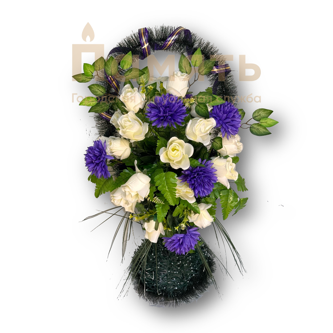 Корзина №100 - фиолетовый, белый из искусственных цветов, композиция имеет форму корзинки с цветами. Ни одна похоронная процессия не обходится без ритуальных, похоронных и траурных венков. Именно они помогают выразить скорбь, грусть и любовь к усопшему, являясь традиционным символом прощания.