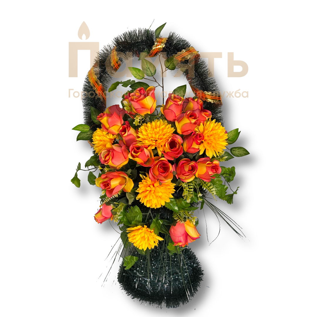 Корзина №100 - красный, оранжевый из искусственных цветов, композиция имеет форму корзинки с цветами. Ни одна похоронная процессия не обходится без ритуальных, похоронных и траурных венков. Именно они помогают выразить скорбь, грусть и любовь к усопшему, являясь традиционным символом прощания.
