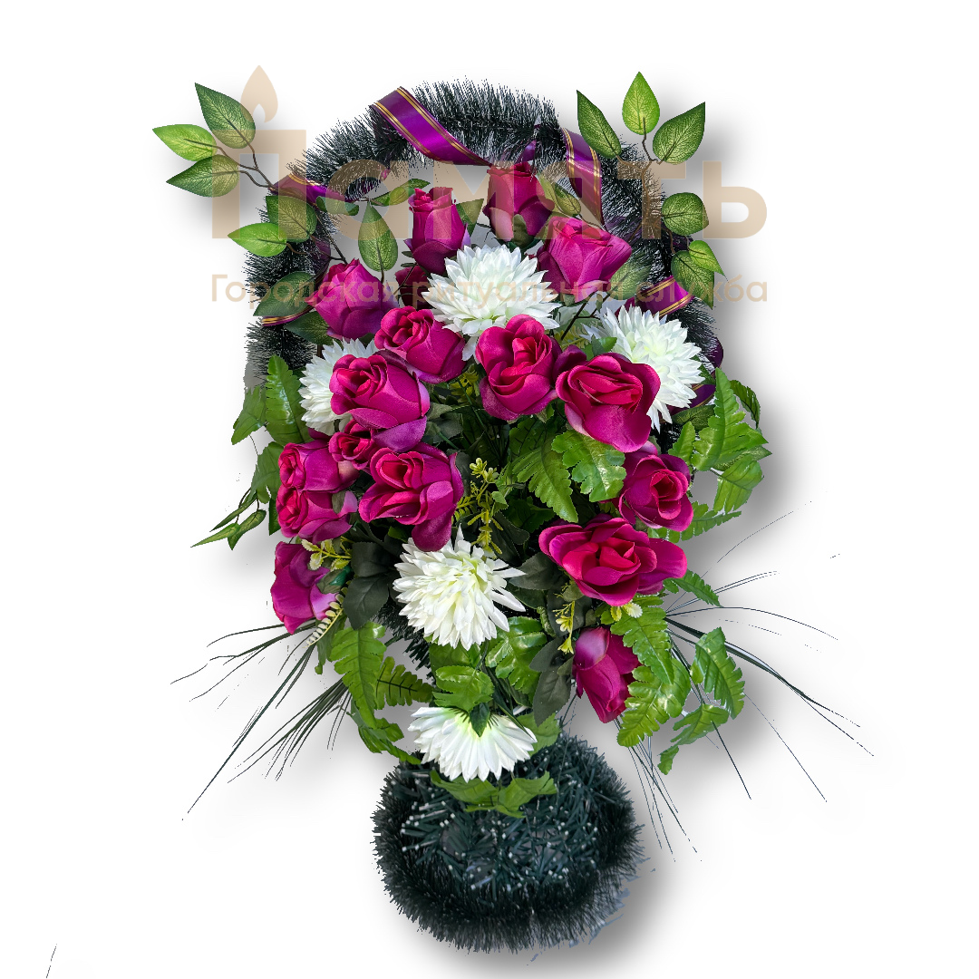 Корзина №100 - темно-розовый, белый из искусственных цветов, композиция имеет форму корзинки с цветами. Ни одна похоронная процессия не обходится без ритуальных, похоронных и траурных венков. Именно они помогают выразить скорбь, грусть и любовь к усопшему, являясь традиционным символом прощания.