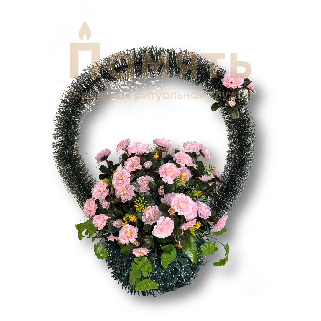 Корзина Нарцисс - розовый из искусственных цветов, композиция имеет форму корзинки с цветами. Ни одна похоронная процессия не обходится без ритуальных, похоронных и траурных венков. Именно они помогают выразить скорбь, грусть и любовь к усопшему, являясь традиционным символом прощания.
