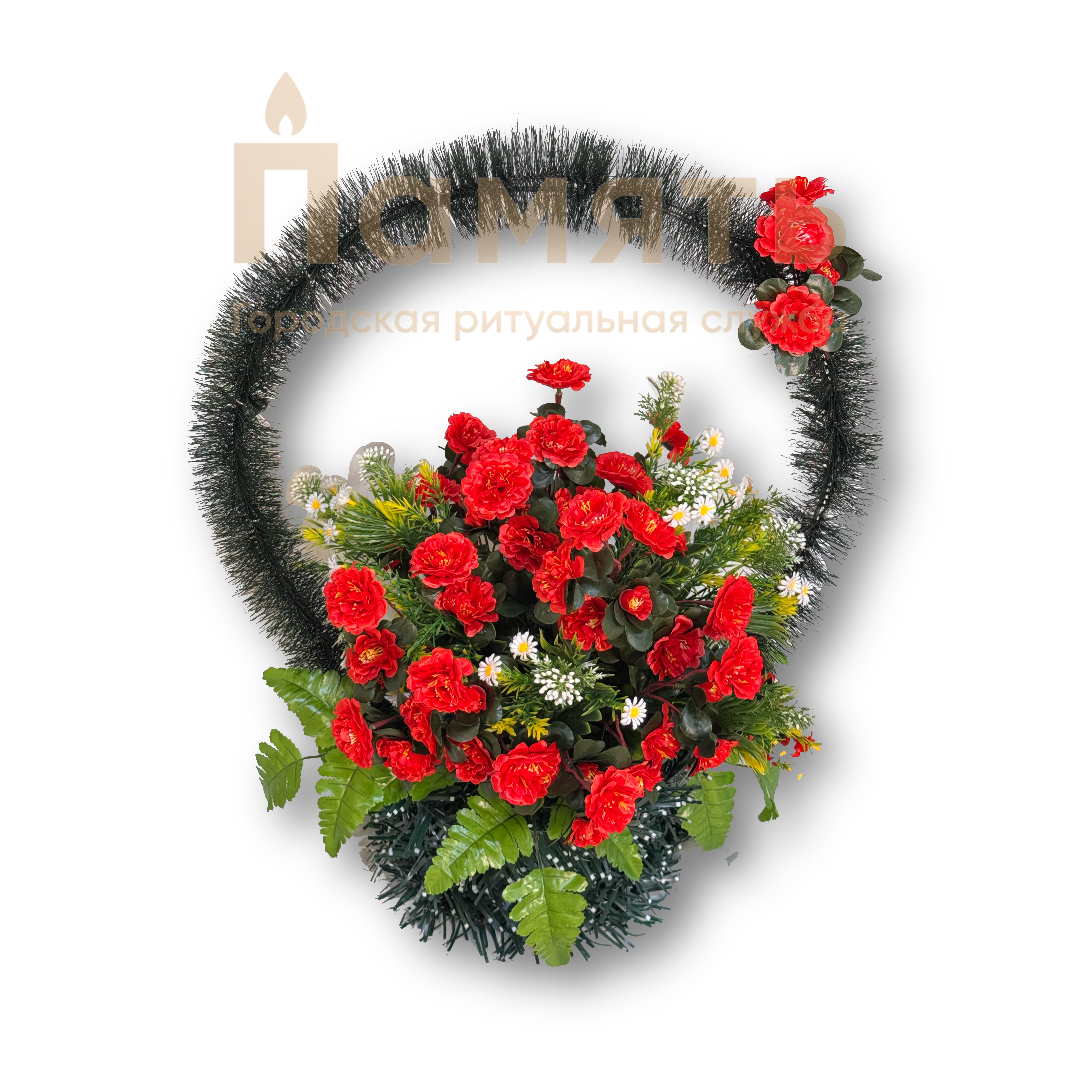 Корзина Нарцисс - красный из искусственных цветов, композиция имеет форму корзинки с цветами. Ни одна похоронная процессия не обходится без ритуальных, похоронных и траурных венков. Именно они помогают выразить скорбь, грусть и любовь к усопшему, являясь традиционным символом прощания.