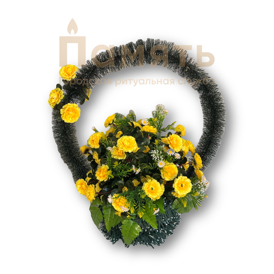 Корзина Нарцисс - желтый из искусственных цветов, композиция имеет форму корзинки с цветами. Ни одна похоронная процессия не обходится без ритуальных, похоронных и траурных венков. Именно они помогают выразить скорбь, грусть и любовь к усопшему, являясь традиционным символом прощания.