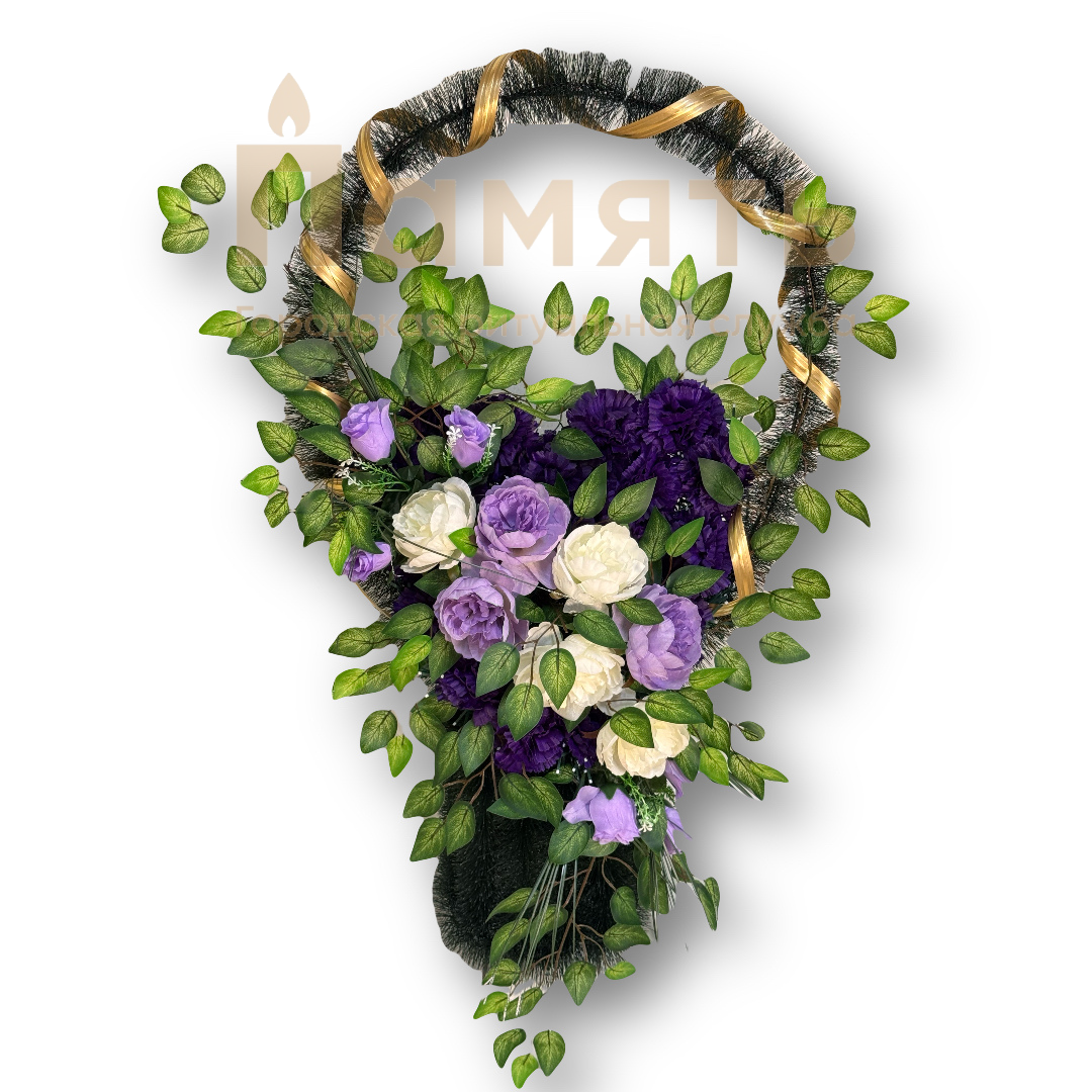 Корзина Сердце - фиолетовый - белый из искусственных цветов, композиция имеет форму корзинки с цветами в форме сердца. Ни одна похоронная процессия не обходится без ритуальных, похоронных и траурных венков. Именно они помогают выразить скорбь, грусть и любовь к усопшему, являясь традиционным символом прощания.