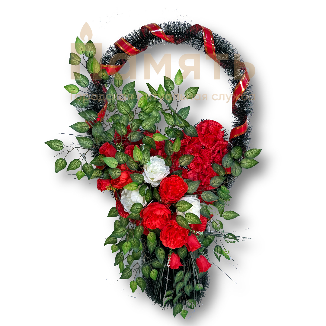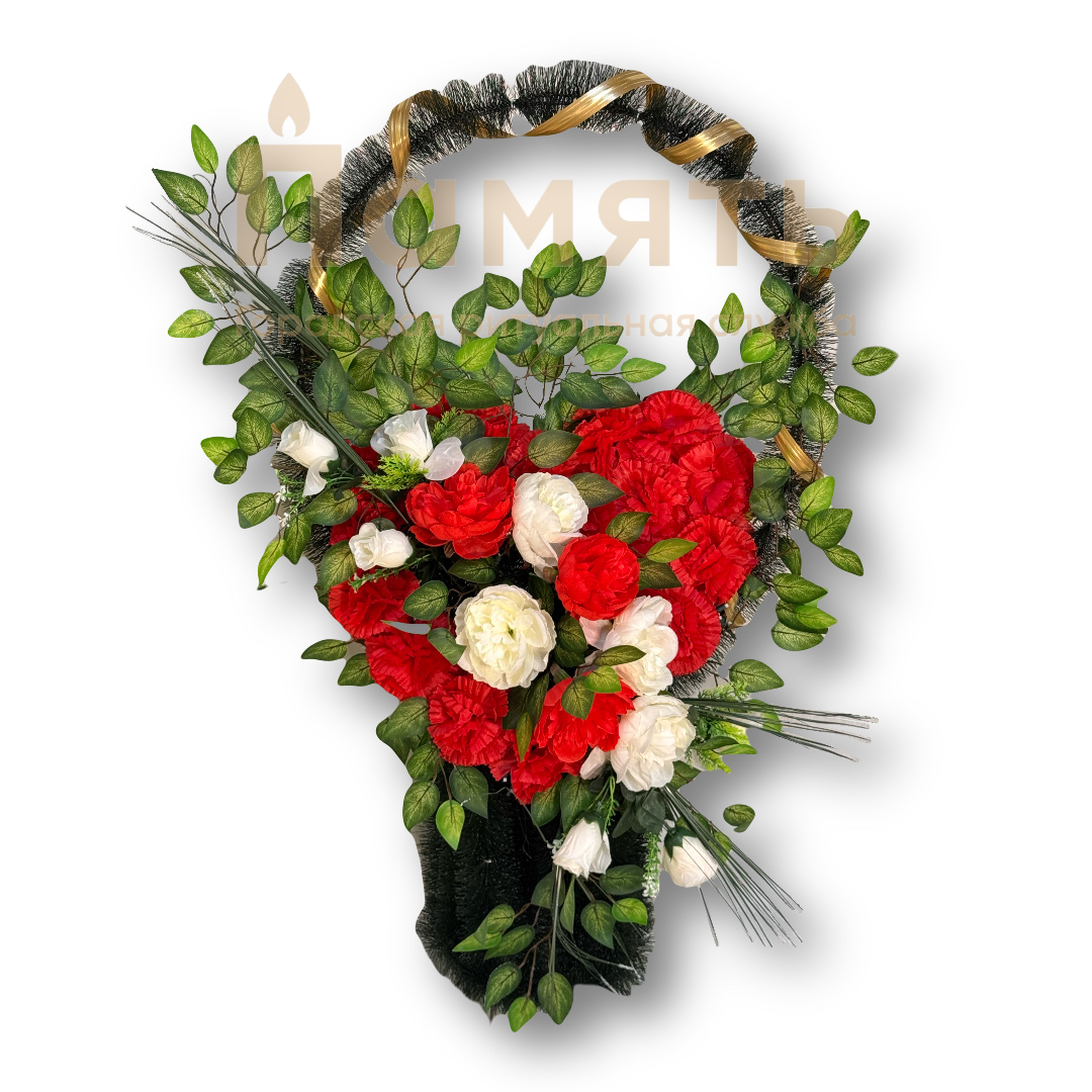 Корзина Сердце - красно – белая из искусственных цветов, композиция имеет форму корзинки с цветами в форме сердца. Ни одна похоронная процессия не обходится без ритуальных, похоронных и траурных венков. Именно они помогают выразить скорбь, грусть и любовь к усопшему, являясь традиционным символом прощания.