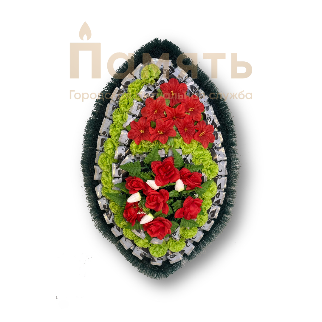 Венок (100см) №03 из искусственных цветов, композиция имеет традиционную овальную форму.