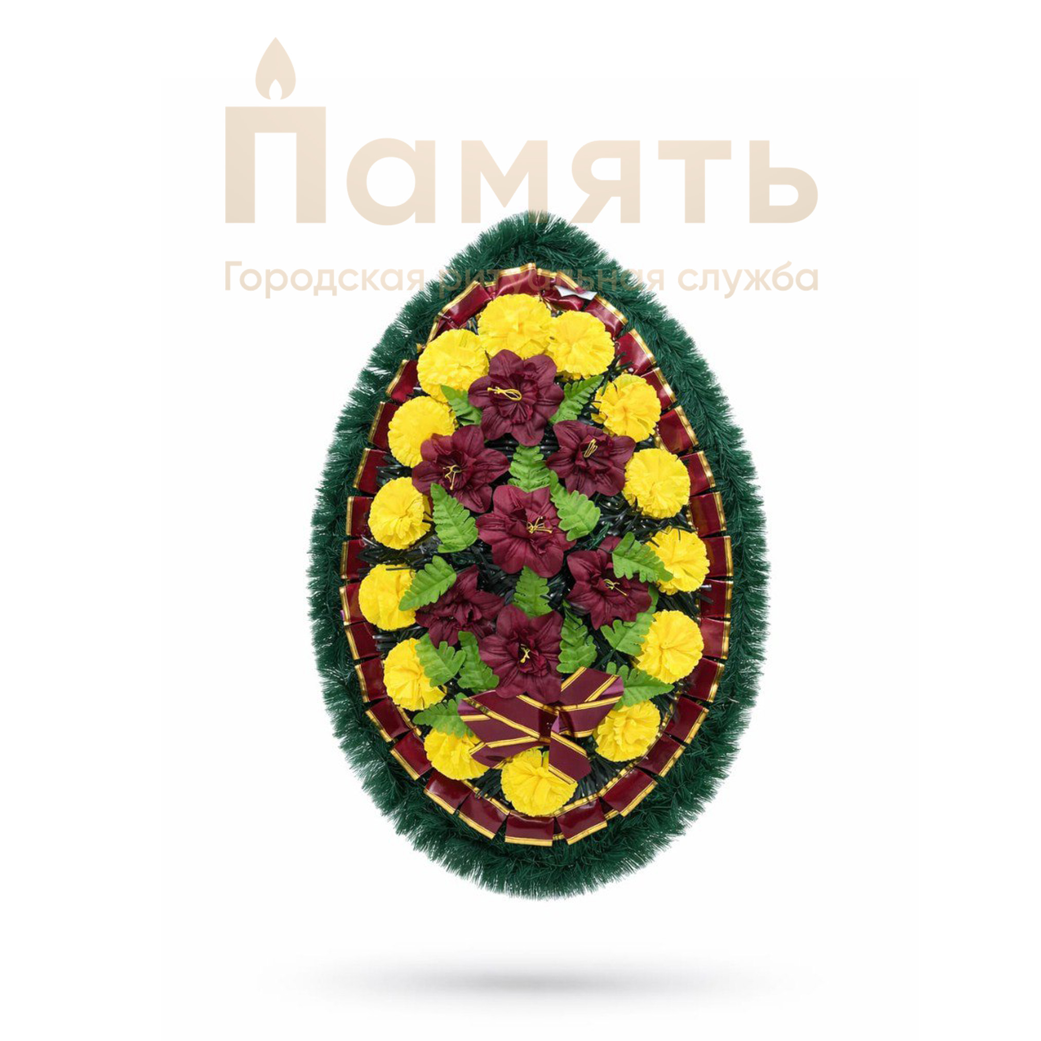 Венок Фонарик - красно-желтый с красной лентой из искусственных цветов, композиция имеет традиционную овальную форму.