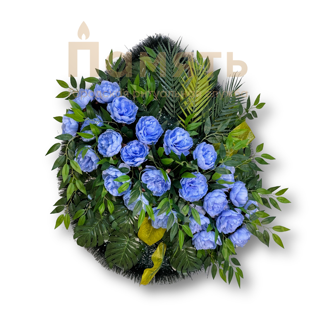 Венок Юнона с пионами - синий из искусственных цветов, композиция имеет традиционную овальную форму.