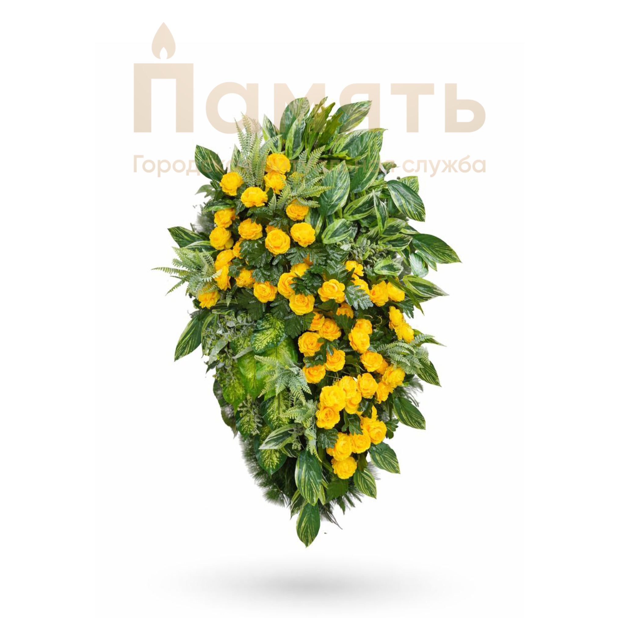 Венок Юнона с пионами - желтый, зеленый из искусственных цветов, композиция имеет традиционную овальную форму.