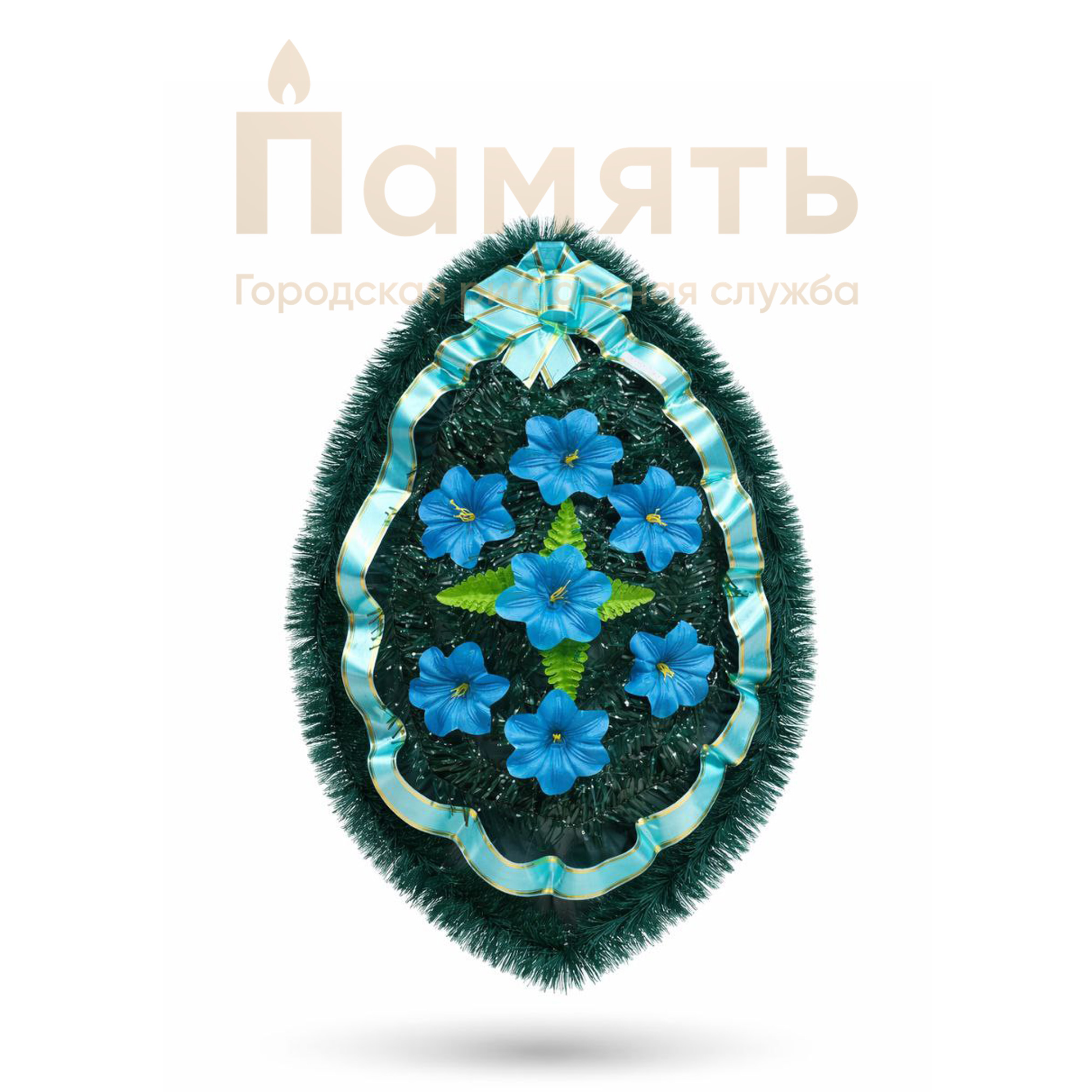 Венок Клепа на ерше - голубой с голубой лентой из искусственных цветов, композиция имеет традиционную овальную форму.