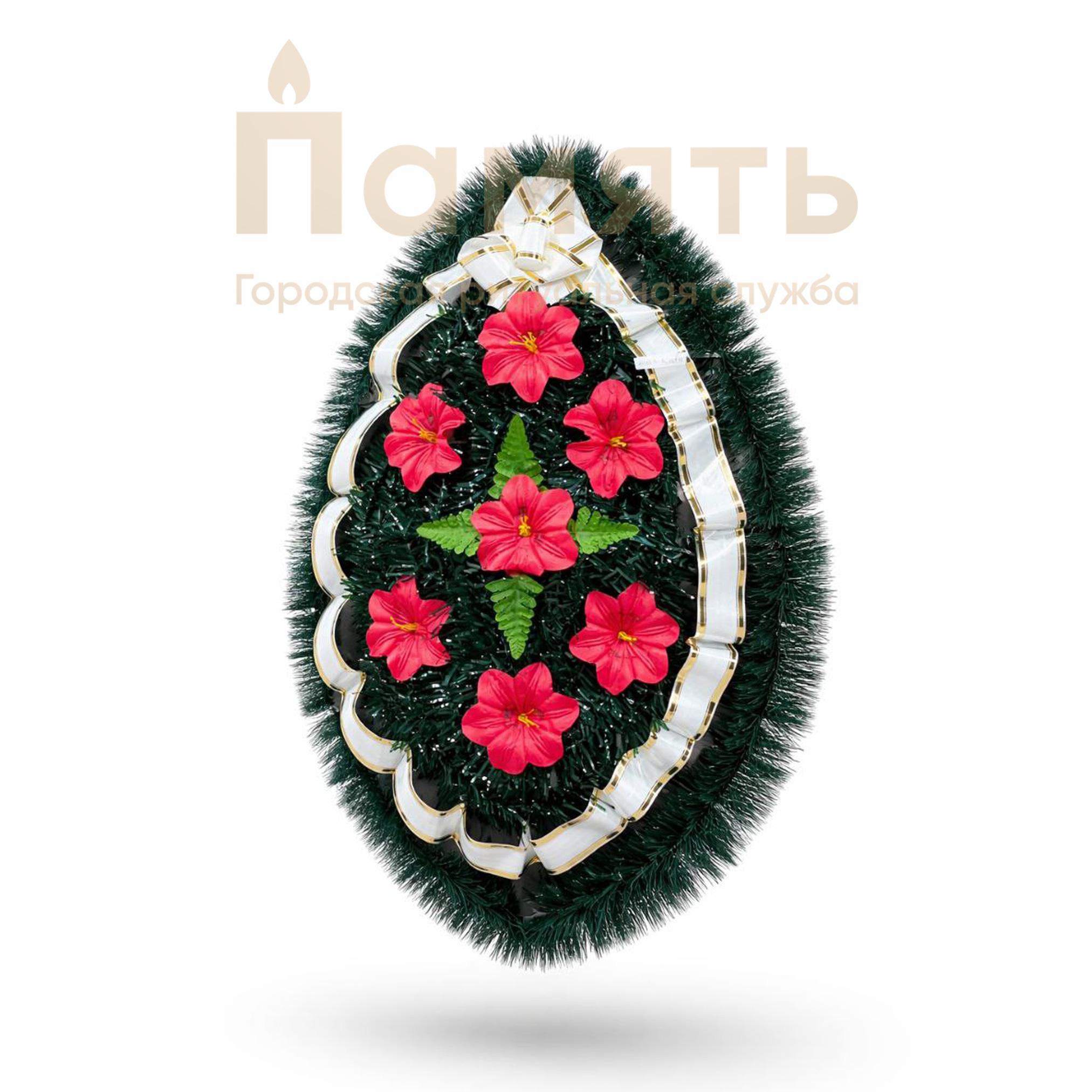 Венок Клепа на ерше - красный с белой лентой из искусственных цветов, композиция имеет традиционную овальную форму.