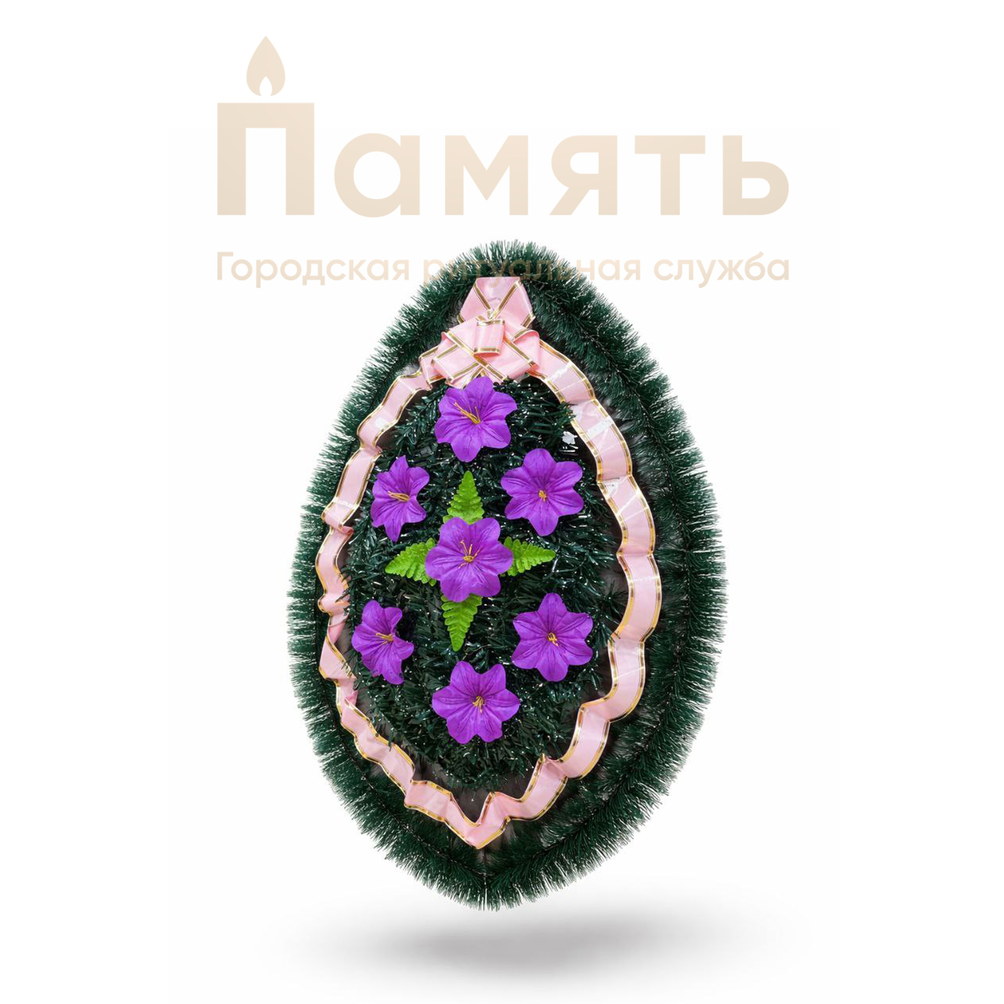 Венок Клепа на ерше - сиреневый с нежно-розовой лентой из искусственных цветов, композиция имеет традиционную овальную форму.