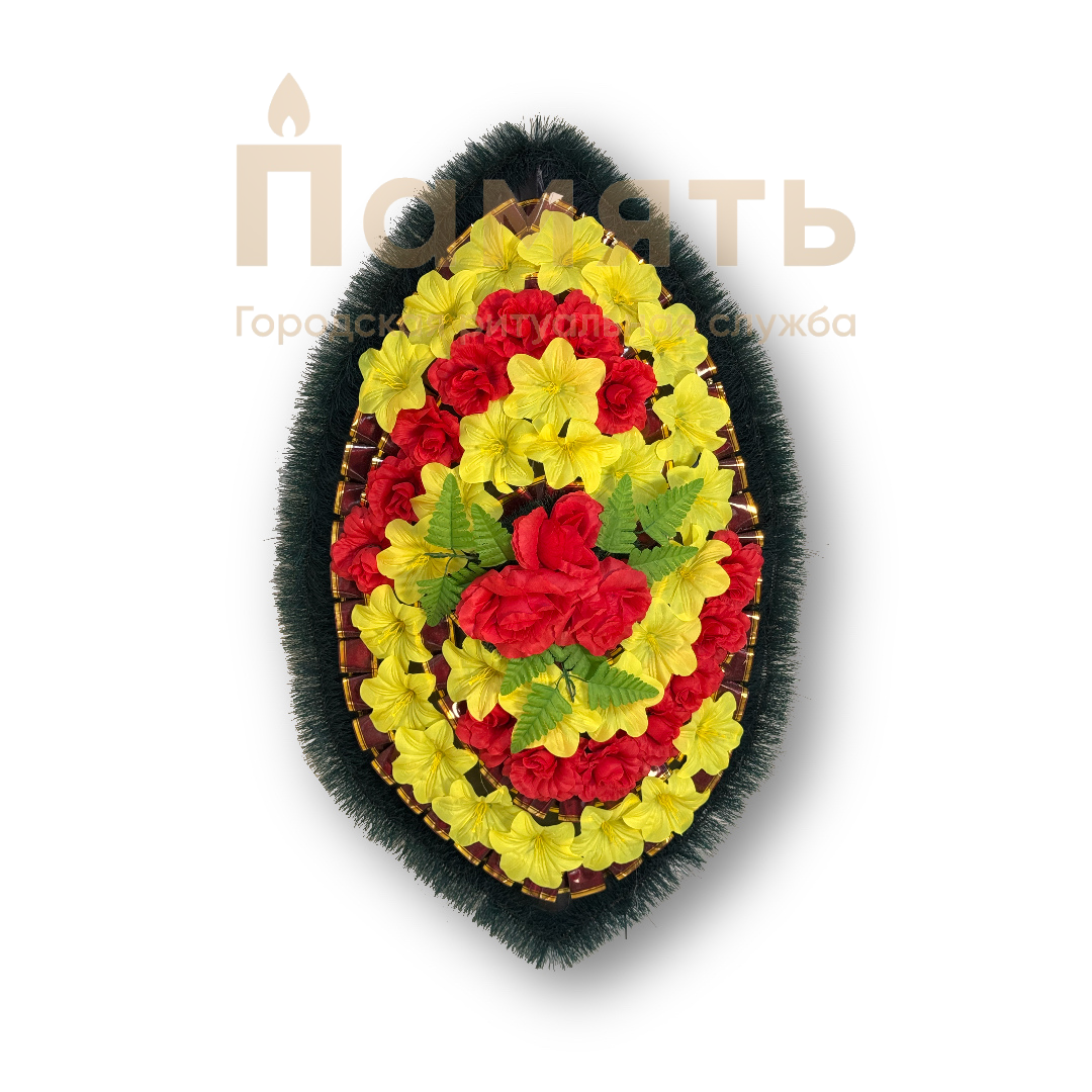 Венок Спираль - красный, желтый из искусственных цветов, композиция имеет традиционную овальную форму.