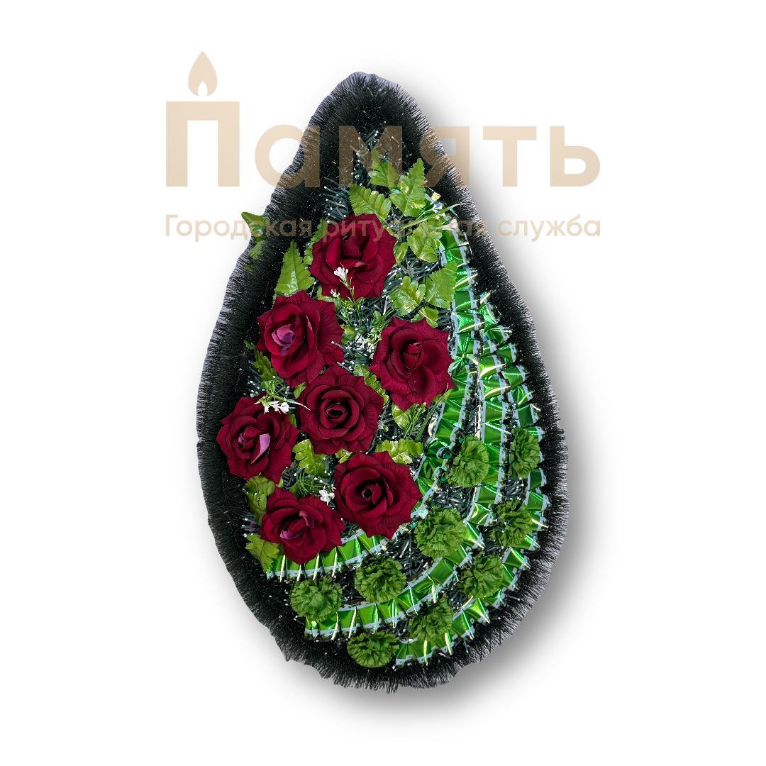 Венок Вечность Бархат - зелено – бордовый из искусственных цветов, композиция имеет традиционную овальную форму.