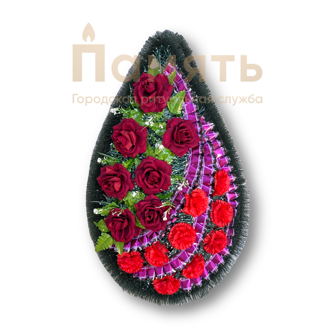 Венок Вечность Бархат - красно – бордовый из искусственных цветов, композиция имеет традиционную овальную форму.