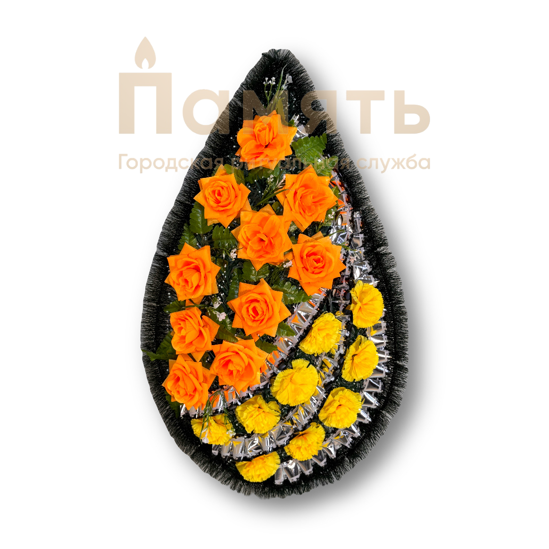 Венок Вечность Шелк - желтый - оранжевый из искусственных цветов, композиция имеет традиционную овальную форму.