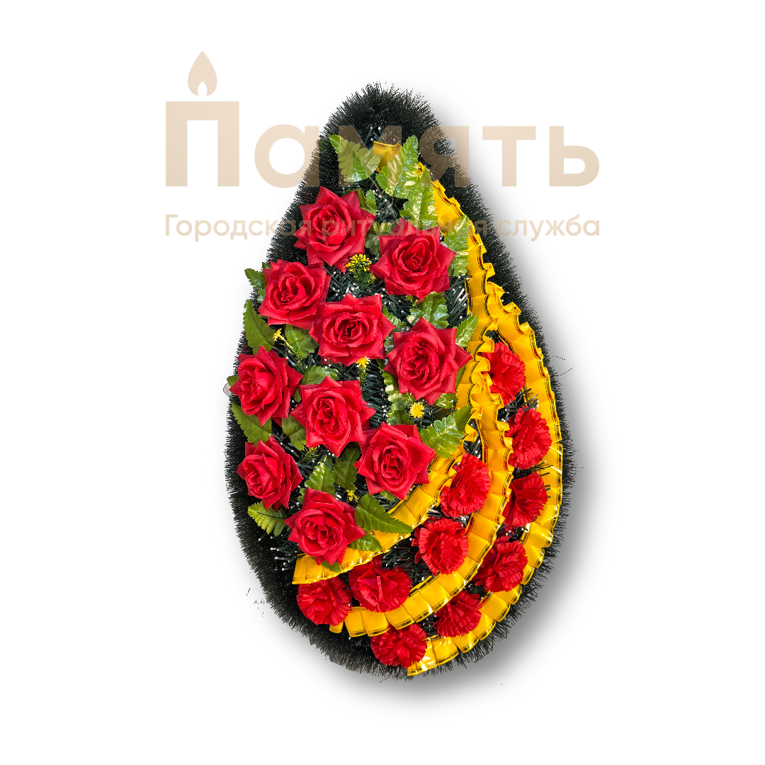 Венок Вечность Шелк - красный - золотой из искусственных цветов, композиция имеет традиционную овальную форму.