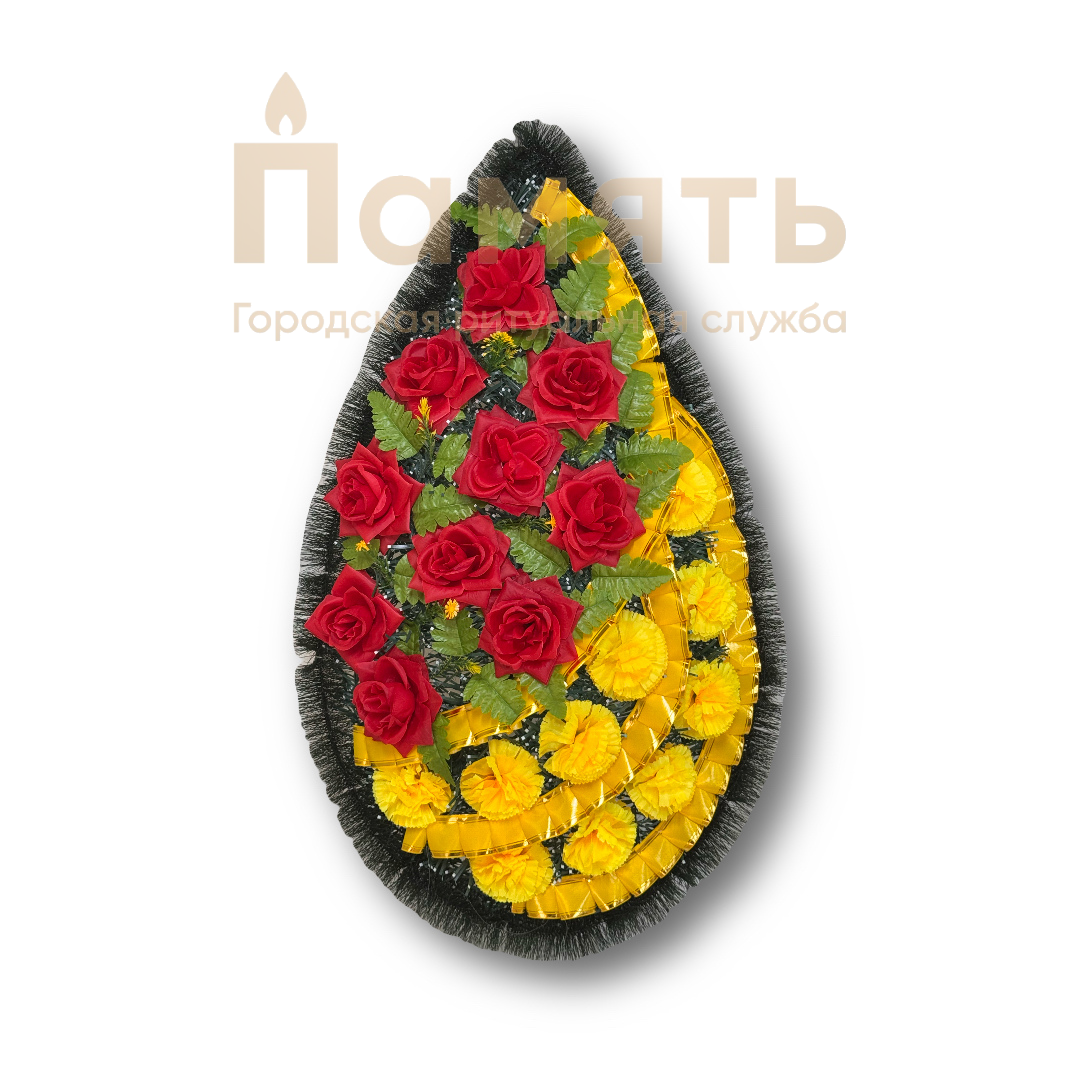 Венок Вечность Шелк - красно – желтый из искусственных цветов, композиция имеет традиционную овальную форму.