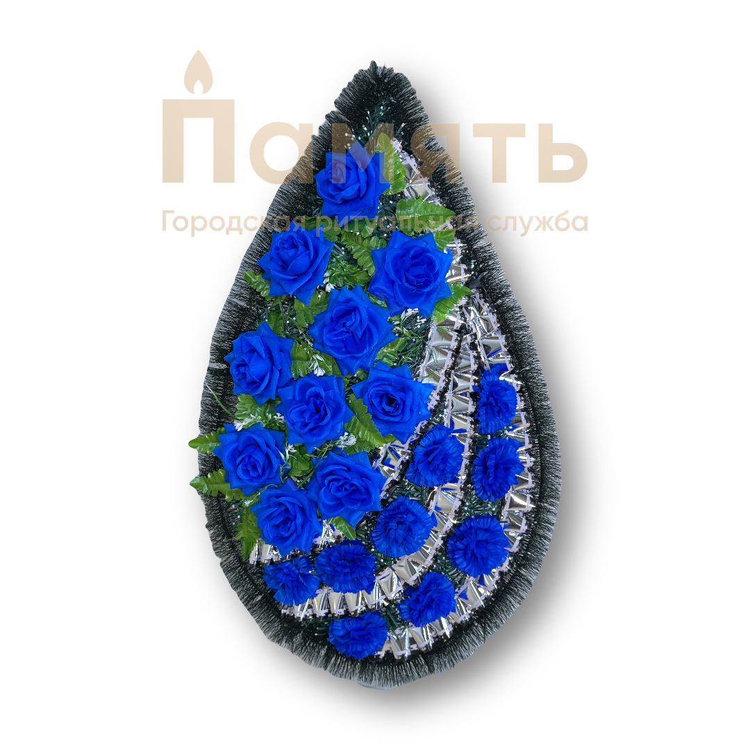 Венок Вечность Шелк - синий из искусственных цветов, композиция имеет традиционную овальную форму.