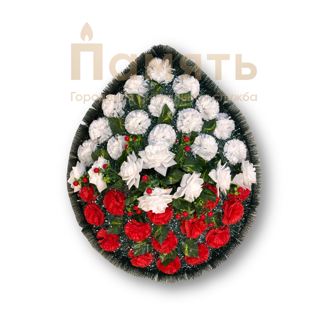 Венок Волга (100см) - белый, красный - композиция из искусственных цветов, традиционно овальной формы.