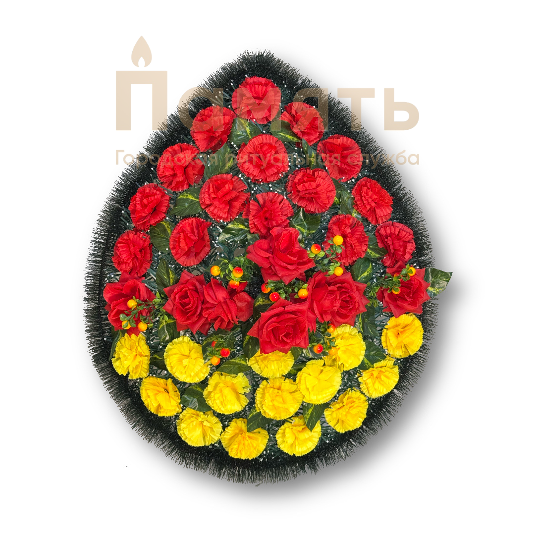 Венок Волга (100см) - красный - желтый - композиция из искусственных цветов, традиционно овальной формы.