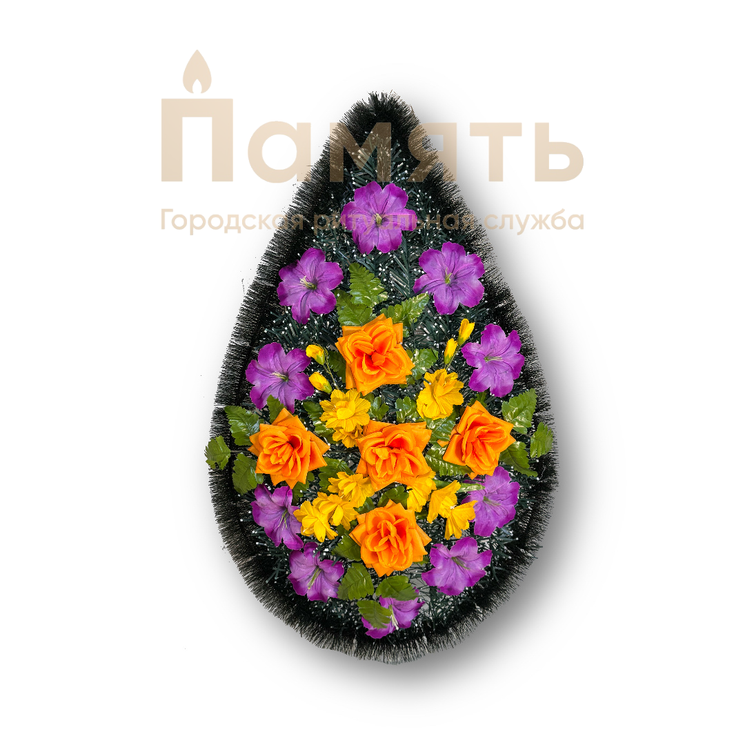 Венок «Восход» - сиреневый, оранжевый из искусственных цветов, композиция имеет традиционную овальную форму.