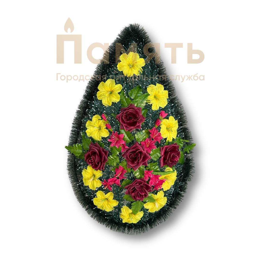 Венок «Восход» - желтый, бордовый из искусственных цветов, композиция имеет традиционную овальную форму.