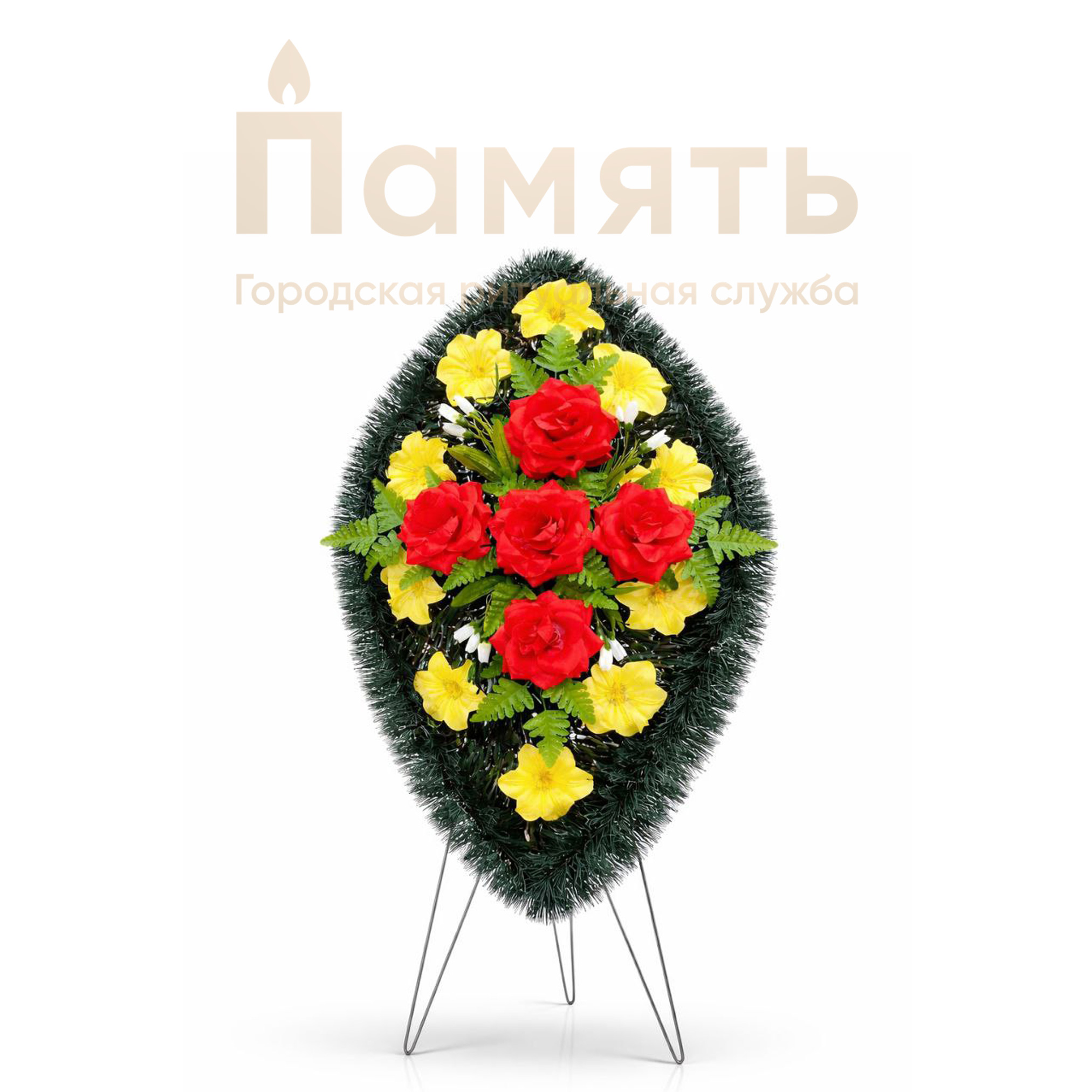 Венок Восхождение 80 см - красный, желтый из искусственных цветов, композиция имеет традиционную овальную форму.