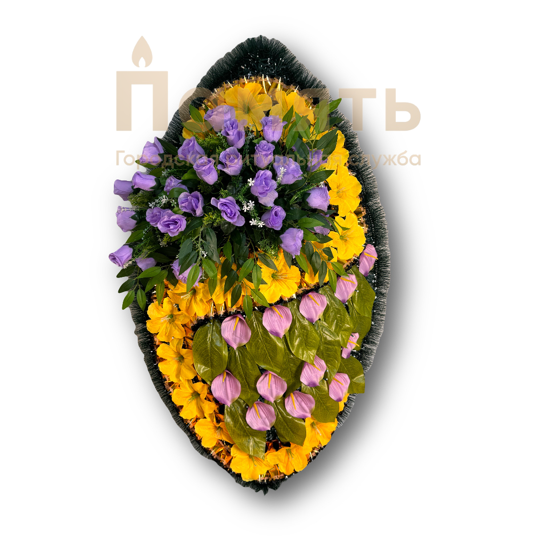 Венок Зигзаг бархат (100см) - фиолетовый, сиреневый - золотая лента из искусственных цветов, композиция имеет традиционную овальную форму. Ни одна похоронная процессия не обходится без ритуальных, похоронных и траурных венков. Именно они помогают выразить скорбь, грусть и любовь к усопшему, являясь традиционным символом прощания.