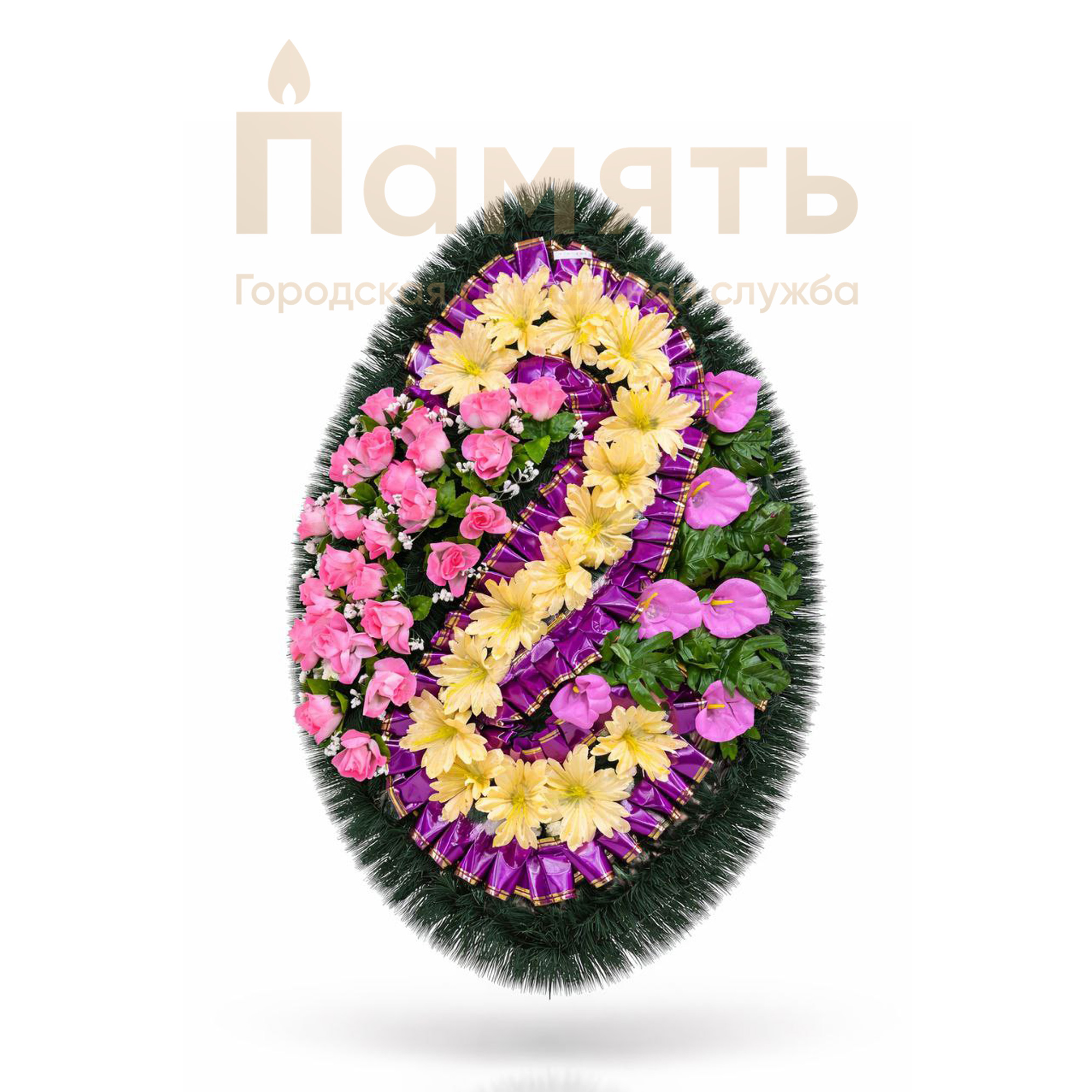 Венок Зигзаг шёлк (100см) - желтый, сиреневый - сиреневая лента из искусственных цветов, композиция имеет традиционную овальную форму.